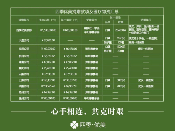 截至2月5日,四季優美(含公司捐贈、創始人個人捐贈及全國各分公司捐贈)累計為抗疫定向捐贈物資口罩313,160只、防護服300套,資金捐贈1,200,650.93元,合計金額2,347,958.84元。