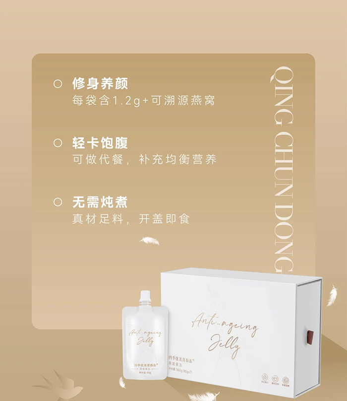 偶爾想給自己輕養(yǎng)一下,含有1.2克可溯源干燕窩的四季優(yōu)美青春凍吸粉不少,除了實(shí)打?qū)嵉难喔C,還有魚膠原蛋白肽、葛根粉、奇亞籽、水蘇糖、低聚木糖、低聚果糖等多種原料的加持,為追求“清、調(diào)、補(bǔ)、養(yǎng)”的你帶來更多驚喜;